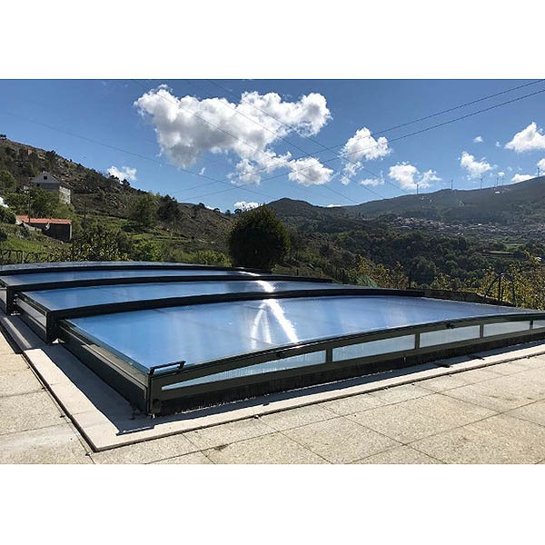 Apertura parcial o total de las cubierta telescópica Olimpia sobre el raíl de aluminio con lo que podrá dejar su piscina total o parcialmente descubierta. La fachada y el fondo de las cubiertas telescópicas se desmonta mediante una operación muy sencilla para permitir una ventilación total en el interior de la cubierta. La colocación del raíl continuo en todos los módulos de la cubierta Olimpia permite su movimiento independiente y se recoge la cubierta a ambos lados de la piscina o incluso en el centro.