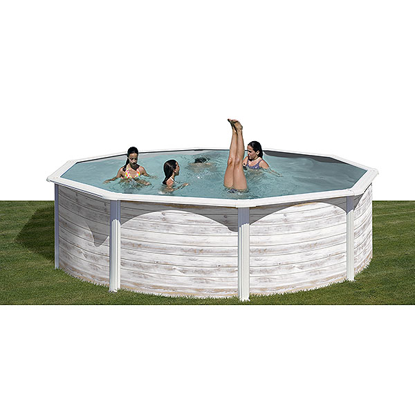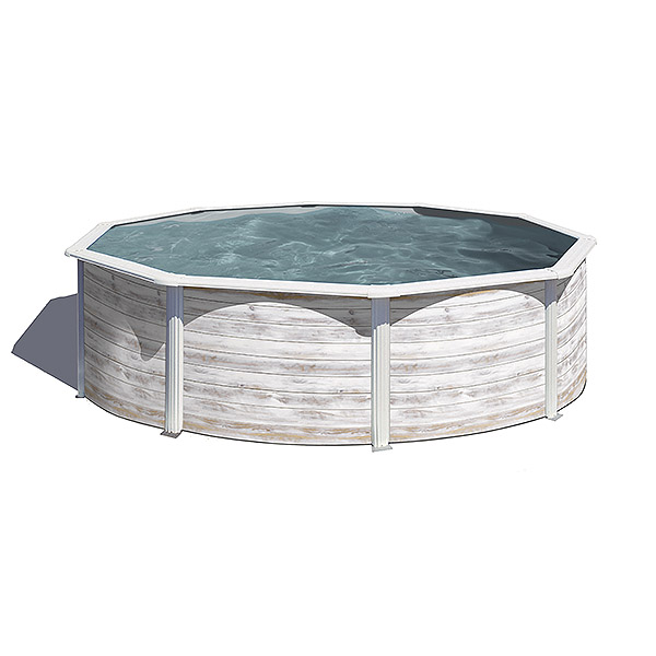 La piscina Finlandia circular se puede colocar en cualquier jardín ya que está disponible en 4 tamaños diferentes ( 2,40m Ø / 3,00m Ø / 3,50m Ø / 4,60m Ø ) con una altura de 1,20m. Incluye de serie todos los elementos necesarios para darle uso. Pertenece a la gama de piscinas de acero elevadas con imitación de madera blanca envejecida de la marca GRE. Es estética, duradera y muy segura.