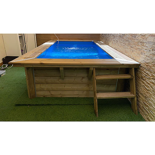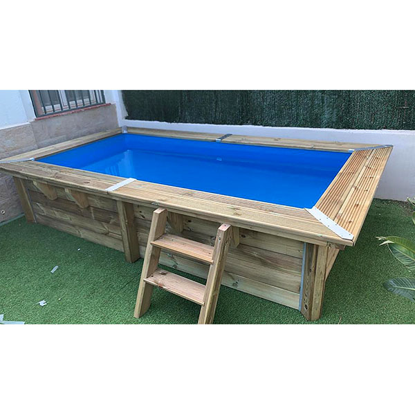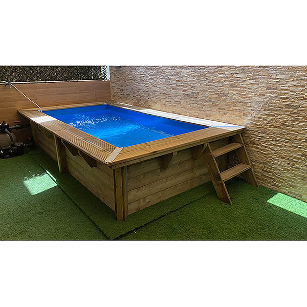 La piscina Rect de 3,50m x 2,00m x 0,71m de altura es una piscina fabricada con una estructura de madera maciza. Sus listones de 45mm de grosor hacen de este modelo una de las mejores opciones en cuanto a piscinas de madera tanto por su tamaño como por su adaptación al espacio exterior así como por su durabilidad y por su inmejorable relación calidad-precio. La Rect de 3,50m de largo x 2,00m de ancho x 0,71m de altura destaca además por ser una piscina muy sencilla de instalar gracias a que los maderos vienen machihembrados y se ensamblan sencillamente, no tiene cuñas ni omegas ni ningún tipo de anclaje al suelo por lo que facilita y agiliza su instalación.
