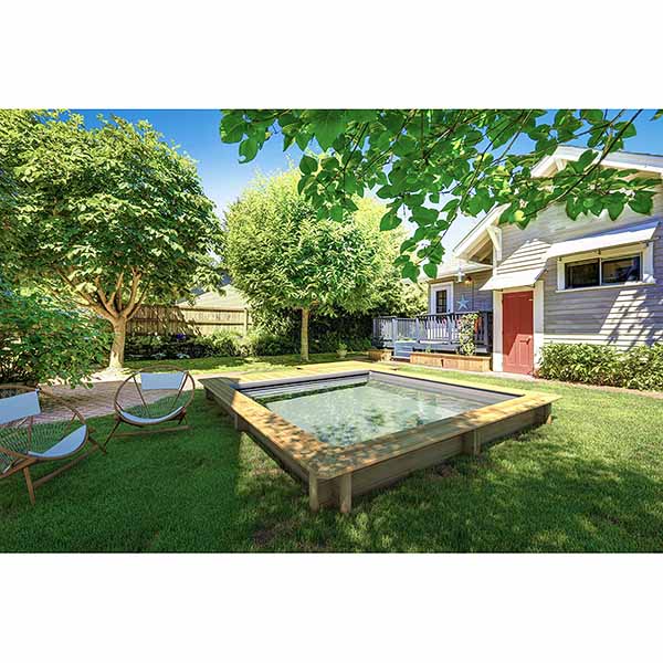 Piscina de madera de la gama Urbaine de BWT con medidas totales de 4,20m x 3,50m x 1,33m de altura.