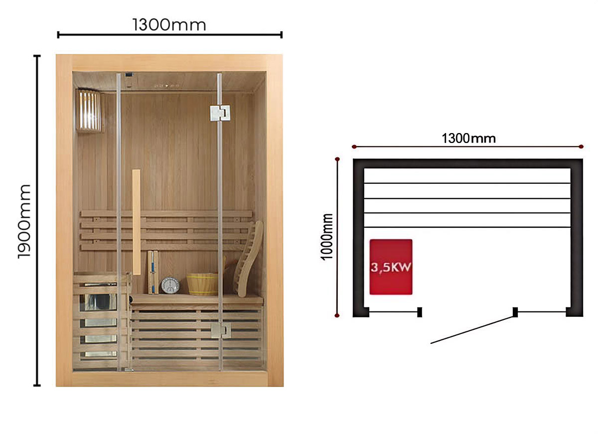 La sauna finlandesa Helsinki 1 es ideal para un uso personal o también para 2 personas. Destaca por la calidad de sus componentes. Está equipada con todos los complementos necesarios ( asientos, respaldo, cubo con cuchara, luminario, termómetro e hidrómetro ) además de una caldera con piedras de 3,5Kw de Harvia ( líder mundial en calderas para saunas de vapor domésticas ). Su estética con su portón acristalado, calidades que otorgan una larga vida útil y acabados, hacen de la sauna Helsinki un modelo perfecto para su uso recurrente en casa. Es resistente a los cambios de temperatura y a la humedad gracias a la calidad ofrecida por la estructura de la sauna ( madera del norte de Canada / Hemlock ).